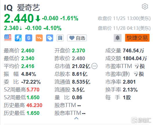 愛奇藝美股行情分析