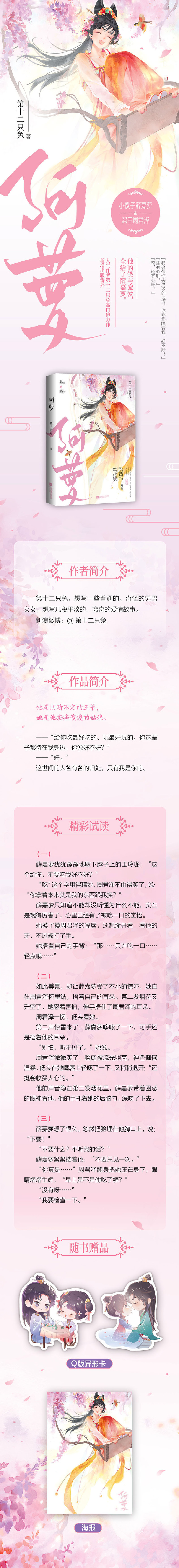 親愛的小仙女們,如果你還沒有讀過《阿蘿與第十二只兔子》,那么趕快行動起來!這本書帶你走進一個充滿奇幻色彩的童話世界,讓你在閱讀的過程中感受到人間的美好和溫暖,相信你一定會愛上這個溫馨的童話小說!也希望大家能夠多多支持這本書,讓它成為你們生活中的一部分,為你們帶來無盡的歡樂和感動!